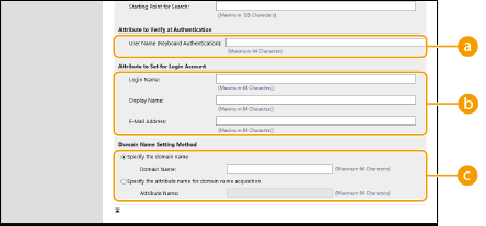 4 | Specificați cum să se seteze numele atributelor și numele de domeniu. ![]() [User Name (Keyboard Authentication):]Specificați câmpul de date LDAP (numele atributului) pentru numele de utilizator de pe serverul LDAP (Exemplu: uid). [Login Name:] / [Display Name] / [E-Mail Address]Specificați câmpurile de date LDAP (numele atributelor) pentru numele de conectare, numele afișat și adresa de e-mail a fiecărui cont de utilizator de pe serverul LDAP (Exemplu: uid, cn, mail). [Specify the domain name] / [Specify the attribute name for domain name acquisition]Selectați cum să se seteze numele de domeniu al destinației de conectare. Pentru a specifica direct numele de domeniu, selectați [Specify the domain name] și introduceți numele de domeniu. Pentru a specifica un câmp de date LDAP (numele atributului) din care să se obțină numele de domeniu de pe serverul LDAP, selectați [Specify the attribute name for domain name acquisition] și introduceți numele atributului (Exemplu: dc). |