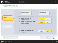Asiguraţi-vă că au fost setate ID-urile de departamente pentru utilizatorii înregistraţi în aparat. Înregistrarea informaţiilor utilizatorului în dispozitivul local Funcţia Gestionare ID-uri departamente este valabilă numai pentru utilizatorii înregistraţi pe dispozitivul local. Dacă vă conectaţi ca utilizator cu privilegii de administrator, un ID şi un PIN de manager de sistem sunt alocate automat şi gestionate ca ID de departament. |