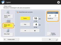 ![]() | Când copiaţi documente originale care sunt mai mici decât dimensiunea hârtiei de ieşire, în imaginea copiată pot să apară liniile de cadru ale documentelor originale. Când copiaţi cărţi groase, pot să apară borduri întunecate. <Şterge Cadru> permite ştergerea acestor linii de cadru şi borduri întunecate. De asemenea, puteţi să setaţi aparatul astfel încât să nu copieze găurile de perforator de pe originale. |