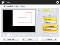 Specificarea zonelor mai complicate (numai dacă apare setarea <Intr. multipuncte>) Puteți specifica zone cu o formă complicată, așa cum se indică în diagrama de mai jos. Apăsați <Intr. multipuncte> pe ecranul din etapa 7 și specificați zona folosind 4 până la 10 puncte. După apăsarea pe ultimul punct, apăsați <Set.multipuncte> pentru a confirma zona. Când utilizați această metodă, puteți specifica o singură zonă. În plus, nu puteți desemna simultan o zonă dreptunghiulară și o zonă poligonală. ![]() Specificarea unei zone mai precise Deoarece zonele sunt specificate pe ecranul de previzualizare, acestea se pot deplasa atunci când se realizează copiile efective. Dacă doriți să specificați zone mai precise, introduceți dimensiunile pe care le-ați măsurat în prealabil. După cum se indică în diagramă, măsurați distanța dintre marginea din dreapta a zonei și marginea din dreapta a originalului (X1), dintre marginea din stânga a zonei și marginea din dreapta a originalului (X2), dintre marginea superioară a zonei și marginea superioară a originalului (Y1) și dintre marginea inferioară a zonei și marginea superioară a originalului (Y2), apăsați <Intr. taste numerice> în etapa 5 și introduceți dimensiunile X1, X2, Y1 și Y2 folosind tastele numerice.