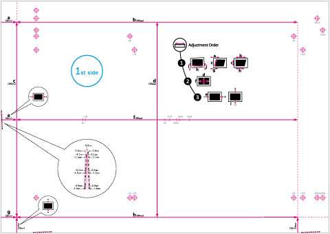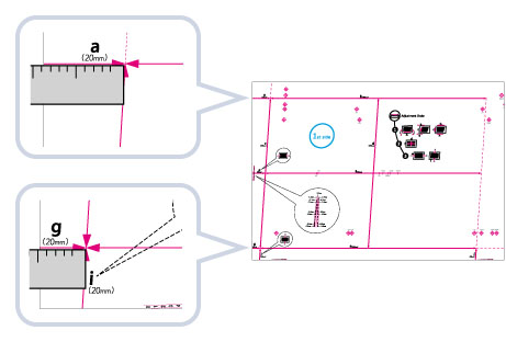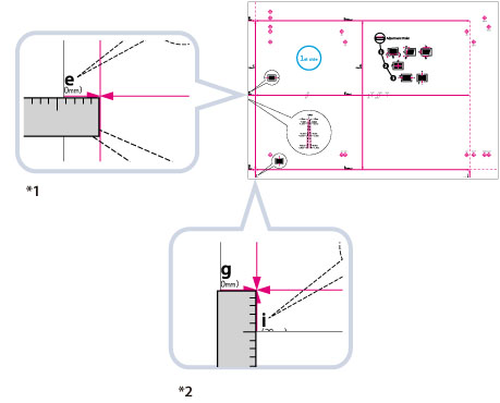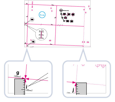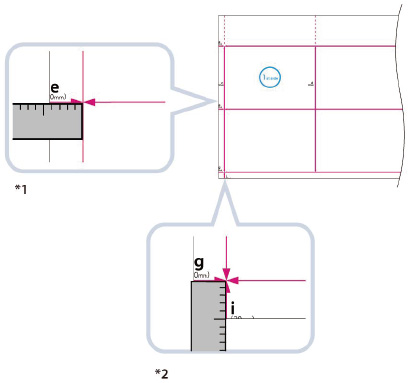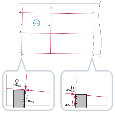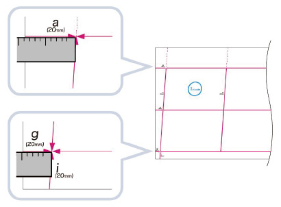 Marcajele „b”, „f”, „h” și „j” pot fi imprimate de mai multe ori, în funcție de formatul hârtiei de ieșire. Efectuați reglarea în poziția cea mai apropiată de marginea din spate a hârtiei. |