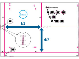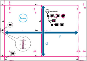 Dacă imprimați pagina de testare utilizând hârtie mai mică de 270 mm x 380 mm, nu puteți măsura lungimea marcajelor „f” și „d”, deoarece imaginea nu va fi imprimată integral pe hârtie. În acest caz, calculați procentul de expansiune/reducere comparând lungimea măsurată a „f/2” și „d/2” cu valorile implicite (f/2: 180 mm, d/2: 125 mm). Utilizând procentajul calculat, reglați raportul de zoom. Reglajul raportului de zoom al imaginii ![]() Exemplu de pagină de testare cu o imagine lipsă. Foaie lungă Dacă imprimați pagina de testare cu foaie lungă utilizând hârtie mai mică de 270 mm x 762 mm, imaginea nu va fi imprimată integral pe hârtie. Calculați procentul de expansiune/reducere comparând lungimea măsurată a „d/2” cu valorile implicite (d/2: 125 mm). Dacă marcajul „f” nu este imprimat în întregime, măsurați lungimea marcajului „f” care este cel mai apropiat de marginea din spate a hârtiei și calculați procentul de extindere/reducere comparând lungimea măsurată cu valorile implicite (f = 450 mm, 550 mm, 650 mm). Utilizând procentajul calculat, reglați raportul de zoom. Reglajul raportului de zoom al imaginii ![]() Exemplu de pagină de testare cu foaie lungă cu o imagine lipsă. |