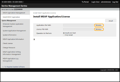 Puteți verifica numărul de aplicații instalate și spațiul utilizat pe dispozitivul de stocare. Administrarea aplicaţiilor MEAP Dacă aplicaţia MEAP nu este livrată cu un Număr de acces licenţă, fişierul dvs. de licenţă va fi asigurat de către furnizorul Aplicaţiei MEAP. Cheia de licenţă şi fişierul de licenţă descrise în prezenta secţiune nu sunt necesare. Pentru mai multe informaţii, citiţi manualul furnizat cu fiecare aplicaţie MEAP. În funcție de aplicația MEAP, poate fi necesară o anumită condiție pentru instalare. Pentru mai multe informații, consultați manualul de utilizare al aplicației MEAP care urmează să fie utilizată. Se pot instala maximum 19 aplicaţii MEAP pe acest aparat. |