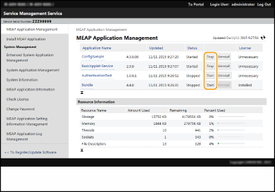 2 | Faceți clic pe [Start] / [Stop] pentru aplicația MEAP care va fi utilizată. ![]() ![]() În funcție de aplicația MEAP, este necesar să reporniți aparatul. Urmaţi instrucţiunile de pe ecran și reporniți aparatul. Când resursele necesare pentru memorie, thread-uri, socketuri sau descriptori de fișiere s-au epuizat, aplicația nu va porni, chiar dacă faceți clic pe [Start]. |