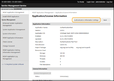 1 | Faceți clic pe [MEAP Application Management] faceți clic pe o aplicație pentru a seta informațiile de autentificare. |