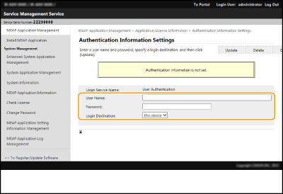 4 | Faceți clic pe [Update]. Este afişat mesajul [Authentication information has been set. Department ID: <ID>]. ![]() Pentru a anula informațiile de autentificare Faceți clic pe [Delete] [Yes] pe pagina cu informații de autentificare din pasul 3. |
