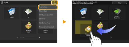 Utilizarea funcţiei AjutorPentru unele funcţii,  se afişează uneori în partea din dreapta sus a ecranului. Apăsaţi  pentru a verifica descrierea şi metoda de operare a funcţiei. Apăsaţi <Sfârşit> pentru a reveni la ecranul anterior. Se operează în aceeaşi manieră ca un smartphone (lovire uşoară/apropiere sau depărtare a degetelor/glisare şi fixare)Pe unele ecrane, puteţi comuta sau derula între pagini mişcând degetul în sus sau în jos sau spre stânga/dreapta ecranului, ca la un smartphone. De asemenea, puteți mări sau micșora ecranul apropiind sau îndepărtând două degete. Puteți trage ecranul mărit cu degetul. Personalizarea aspectului afişării ecranului şi a condiţiilor de operareDacă <Permite mărirea ecranului> este setat la <Pornit>, întregul ecran este mărit/micșorat atunci când se efectuează operațiuni de apropiere/depărtare a degetelor pe ecranul de previzualizare. Dacă <Permite mărirea ecranului> este setat la <Oprit>, numai imaginea de previzualizare este mărită/micșorată. Ecran Previzualizare Ecran PrevizualizareEcran Previzualizare | | | Dacă opţiunea <Permite mărirea ecranului> este setată la <Pornit> | sau