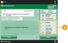 ![]() Ecranul Caracteristici de bază pentru copiere | ![]() Ecranul Caracteristici de bază pentru fax |