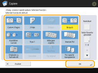Înregistrarea în <Setări Favorite>În <Setări Favorite> puteţi înregistra procedurile utilizate frecvent pentru copiere, precum şi destinaţiile şi setările specificate frecvent pentru scanare. Pentru mai multe informații, consultați Înregistrarea unei combinaţii de funcţii utilizate frecvent. Modificarea setării implicite din ecranul Caracteristici de bazăDupă modificarea setărilor pentru fiecare funcţie, puteţi să înregistraţi setările curente ca setări implicite ale ecranului Caracteristici de bază, apăsând urmat de <Modificare setări implicite>. Dacă v-aţi conectat la aparat prin gestionarea autentificării personale (Conectarea la aparat) înainte de a efectua această setare, aceasta se va înregistra ca setare implicită personală proprie (Lista articolelor care pot fi personalizate). |