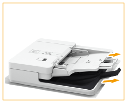 Când introduceți originale de dimensiuni mari, trageți extensia tăvii de alimentare cu originale și extensia tăvii de ieșire a originalelor pentru a preveni căderea acestora peste marginea alimentatorului.