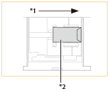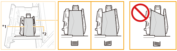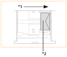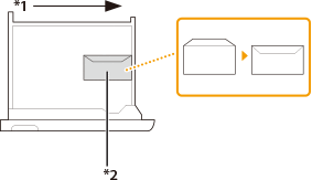 Plicurile rulate sau ondulate trebuie îndreptate înainte de utilizare. Verificaţi ca înălţimea teancului de plicuri să nu depăşească semnul pentru limită de înălţime ( )Înălţimea (cantitatea) maximă a plicurilor care se pot încărca în casetă este de aproximativ 33,5 mm. Înălţimea (cantitatea) maximă a plicurilor variază în funcţie de tipul de plicuri şi de condiţiile de operare ale utilizatorului, dar ca referinţă, 33,5 mm înseamnă aproximativ 50 de plicuri. Verificați suprafața plană a plicurilor atunci când le încărcați în sertarul pentru hârtie. Dacă nivelul marginii frontale a plicurilor este mai ridicat decât cel al marginii posterioare, reîncărcați plicurile astfel încât marginea frontală a plicurilor să fie la același nivel sau mai jos decât cel al marginii posterioare, așa cum se arată în ilustrația de mai jos. ![]() *1 Parte frontală a sertarului pentru hârtie *2 Parte posterioară a sertarului pentru hârtie |