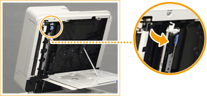 | Trageți maneta superioară pentru a deschide capacul zonei de scanare a documentelor. Deschideți ușor capacul, astfel încât să nu deteriorați sticla platoului. |