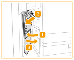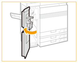 După ce îndepărtați hârtia lungă blocată și închideți capacul frontal din stânga al unității principale, este posibil să apară un ecran care vă solicită să deschideți capacul frontal al unității de inserție sau al dispozitivului de finisare. Puteți face acest ecran să dispară deschizând, apoi închizând capacul frontal al unității principale în chestiune. |