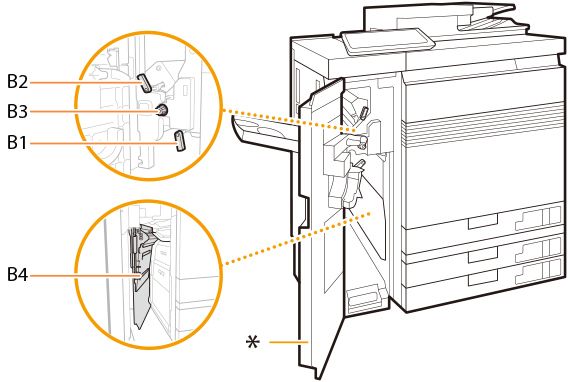 Rotiți butonul de reglaj B3 în sens invers acelor de ceasornic pentru a alimenta hârtia blocată către ghidajul B1.