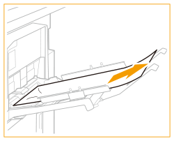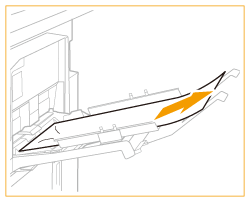 Această secțiune descrie cazul în care echipamentul „Long Sheet Tray-B” este atașat la unitatea principală. Dacă „Long Sheet Tray-B” este atașat la „Multi-drawer Paper Deck-E” sau la „POD Deck-F”, consultați Când sursele opționale de hârtie sunt atașate la Multi-drawer Paper Deck-E sau Când sursele opționale de hârtie sunt atașate la POD Deck-F. Această secțiune descrie modul de eliminare a blocajelor de coli lungi. Modul de eliminare a blocajelor de hârtie simplă este același cu cel de la „Stack Bypass-D”. Scoateți foaia lungă din unitatea principală atunci când se afișează pe câmpul de dispozitiv de pe ecran sau când nu mai sunt decât 25 mm de hârtie la capătul din spate al hârtiei din tavă. <B Tava universală (Trageţi maneta de deschidere.)>, <B B1/B4> și <B C2/C3/C4/C5/C6> sunt afișate ca locații ale blocajului de hârtie |