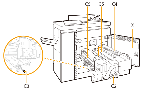 ![]() | Verificați dacă pe cureaua de alimentare (C5) au rămas bucăți de hârtie. Dacă rămân bucăți de hârtie, îndepărtați-le. ![]() |