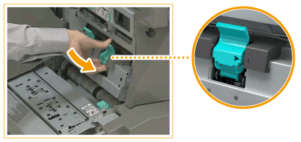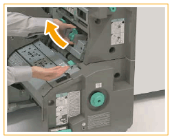 Verificați înainte de a elimina blocajele de capseDacă se produce un blocaj de hârtie odată cu un blocaj de capse, scoateţi hârtia blocată înainte de a scoate capsele blocate. Înainte de a elimina blocajul de capse, scoateţi toată hârtia ieşită din tava de broşuri. |