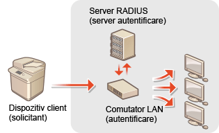 Dacă un dispozitiv încearcă să se conecteze şi să înceapă să comunice pe o reţea 802.1X, dispozitivul trebuie să treacă prin autentificarea utilizatorului pentru a demonstra că acea conexiune este realizată de un utilizator autorizat. Informaţiile de autentificare sunt trimise către şi verificate de un server RADIUS, care permite sau respinge comunicarea cu reţeaua în funcţie de rezultatele autentificării. Dacă autentificarea eşuează, un switch LAN (sau un punct de acces) blochează accesul din exterior la reţea. Aparatul se poate conecta la o reţea 802.1X ca un dispozitiv client.