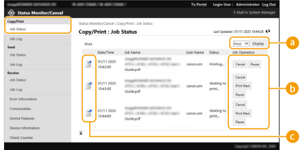 Puteţi verifica starea documentelor care aşteaptă să fie copiate sau imprimate. Puteţi, de asemenea, să prelucraţi un document înaintea celorlalte sau să anulaţi un document.