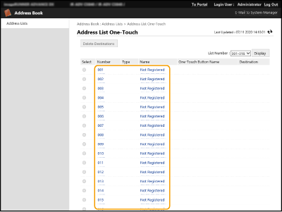 2 | Faceţi clic pe [Not Registered] sau pe un număr rapid neînregistrat. Se afişează [Not Registered] în [Name] pentru butoanele rapide neînregistrate. Pentru a afişa butoanele rapide care nu apar în listă, selectaţi intervalul de numere din [List Number], apoi faceţi clic pe [Display]. ![]() |