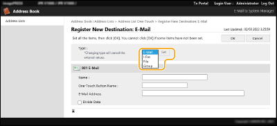1 | Faceţi clic pe lista de adrese în care urmează să înregistraţi destinaţia ([Personal Address List], Liste de adrese ale grupurilor de utilizatori, de la [Address List 01] până la [Address List 10] sau [Address List for Administrators]). [Personal Address List] este pentru uzul exclusiv al utilizatorului conectat şi este disponibilă numai când gestionarea autentificărilor personale este activată. [Address List for Administrators] este disponibilă numai pentru administratorii care se conectează cu privilegii de Administrator sau de DeviceAdmin. Dacă este afişată pagina pentru introducerea unui PIN, introduceţi PIN-ul şi faceţi clic pe [OK]. Dacă doriţi să partajaţi destinaţia cu un grup de utilizatori înregistraţi, selectaţi o Listă de adrese Grup utilizatori înregistraţi. ![]() De asemenea, puteţi să gestionaţi Listele de adrese ale grupurilor de utilizatori permiţând numai utilizatorilor cu privilegii de Administrator să înregistreze/editeze destinaţiile utilizând IU la distanţă. <Folosiţi doar lista de adrese de grup> |