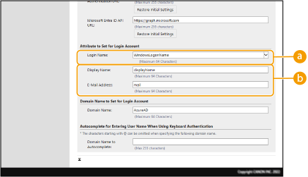 4 | Specificați atributele. ![]() [Login Name]Din meniul derulant, selectați atributul pentru numele de autentificare al fiecărui cont de utilizator de pe server. *Pentru a specifica un atribut care nu este afișat în meniul derulant, îl puteți introduce direct. [WindowsLogonName]: displayName este obținut din Microsoft Entra ID. displayName se modifică după cum urmează pentru a crea numele de autentificare: