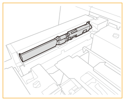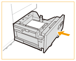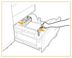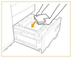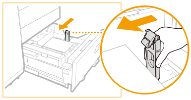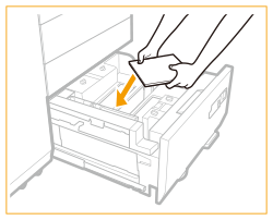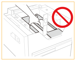 Dacă hârtia se termină și imprimarea se oprește în timp ce imprimați cu setarea de capsare, nu îndepărtați colile de ieșire care așteaptă să fie capsate. (Tipărirea şi capsarea se reiau după deblocarea hârtiei.) Dacă trebuie să ridicaţi elevatorul (de exemplu, dacă aţi scăpat obiecte în interiorul magaziei de hârtie), nu o faceţi pe o lungime mai mare de 50 mm sau pe diagonală, deoarece aparatul se poate defecta sau deteriora. Nu ridicaţi elevatorul din interiorul magaziilor de hârtie când alimentarea generală este pornită, deoarece aparatul se poate defecta sau deteriora. Dacă trebuie să ridicaţi elevatorul, de exemplu dacă aţi scăpat obiecte, opriţi alimentarea generală cu magaziile de hârtie deschise. Pentru instrucţiuni despre oprirea aparatului, consultați Pornirea aparatului. ![]() |