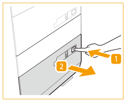 Dacă aparatul se află în modul Hibernare, este posibil să nu puteţi deschide magazia de hârtie. În această situație, reactivați aparatul, apoi apăsaţi butonul de deschidere de pe „Multi-drawer Paper Deck-E”. Dacă se utilizează hârtie subțire cretată pentru imprimare, aceasta se poate șifona în funcție de ultimele lucrări de imprimare. În acest caz, lăsați magazia de hârtie deschisă timp de aproximativ 10 minute pentru a reduce temperatura acesteia, apoi reluați imprimarea. |