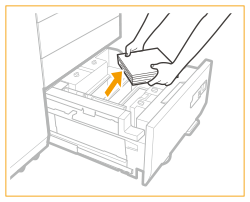 Puteţi încărca hârtie cu format personalizat dacă ambele feţe ale hârtiei au între 182 mm şi 487,7 mm lungime şi între 139,7 mm şi 330,2 mm lăţime. Nu puteţi încărca hârtie cu format personalizat dacă una din feţe este mai mică sau mai mare decât formatele de hârtie care se pot încărca. Dacă în timpul imprimării apare un mesaj care solicită să se încarce hârtie, restul de imprimate se realizează automat după încărcarea hârtiei corespunzătoare. Dacă selectaţi o sursă diferită de hârtie, restul de imprimări se efectuează după ce apăsaţi <OK>. Pentru a anula imprimarea, apăsaţi <Anulare>. Când schimbaţi hârtia de încărcat în „Multi-drawer Paper Deck-E” din hârtie simplă în hârtie cretată, este posibil să aşteptaţi puţin, fiindcă este necesară reglarea temperaturii aerului cald care ventilează hârtia. Consultați Ghidul de utilizare a materialelor de specialitate și efectuați setările corespunzătoare pentru hârtia care urmează să fie încărcată în „Multi-drawer Paper Deck-E”. |