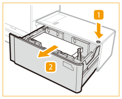 Dacă aparatul se află în modul Hibernare, este posibil să nu puteţi deschide magazia de hârtie. În acest caz, reactivați aparatul, apoi apăsaţi butonul de deschidere de pe „POD Deck Lite XL-A”. Dacă se utilizează hârtie subțire cretată pentru imprimare, aceasta se poate șifona în funcție de ultimele lucrări de imprimare. În acest caz, lăsați magazia de hârtie deschisă timp de aproximativ 10 minute pentru a reduce temperatura acesteia, apoi reluați imprimarea. |
