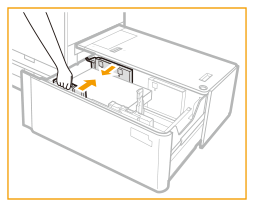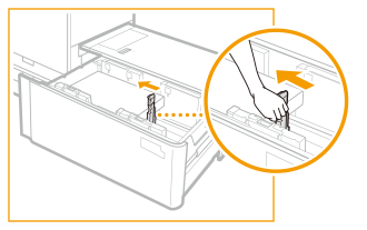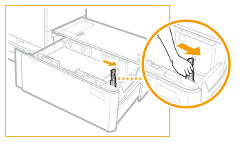 Ținând teancul de hârtie apăsat pe peretele din stânga, glisați placa de modificare a formatului din stânga (exterioară) în direcția hârtiei.