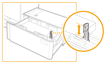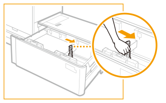 Apăsând pe levier, așa cum se arată în ilustrație, glisați plăcile de modificare a formatului (exterioare și interioare) și reglați-le în funcție de formatul hârtiei utilizate.