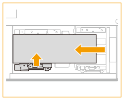 Dacă selectaţi „POD Deck Lite XL-A” când nu are hârtie sau dacă „POD Deck Lite XL-A” rămâne fără hârtie în timpul unei lucrări de imprimare, pe afişajul panoului tactil apare un ecran care solicită încărcarea cu hârtie. Urmaţi procedura de mai jos pentru a încărca hârtie în „POD Deck Lite XL-A”.