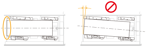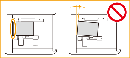Dacă trebuie să ridicaţi elevatorul (de exemplu, dacă aţi scăpat obiecte în interiorul echipamentului „POD Deck Lite XL-A”), nu o faceţi pe o lungime mai mare de 50 mm sau pe diagonală, deoarece aparatul se poate defecta sau deteriora. Nu ridicaţi elevatorul din interiorul magaziilor de hârtie când alimentarea generală este pornită, deoarece aparatul se poate defecta sau deteriora. Dacă trebuie să ridicaţi elevatorul, de exemplu dacă aţi scăpat obiecte, opriţi alimentarea generală cu magaziile de hârtie deschise. Pentru instrucţiuni despre oprirea aparatului, consultați Pornirea aparatului. Nu supuneți la șocuri puternice opritorul muchiei posterioare când încărcați hârtie în magazia de hârtie, deoarece acest lucru poate duce la funcționarea defectuoasă sau la deteriorarea aparatului. Reglați corect plăcile de modificare a formatului (exterioare și interioare) și opritorul muchiei posterioare pentru a evita blocarea hârtiei, imprimările cu pete sau murdărirea interiorului aparatului. Hârtia ondulată trebuie îndreptată înainte de a o încărca în magazia pentru hârtie. Nu veţi putea copia sau imprima dacă veţi încărca hârtie peste marcajul limitei de încărcare (  ) sau dacă magazia pentru hârtie nu este împinsă complet în aparat. Asiguraţi-vă că înălţimea teancului de hârtie nu depăşeşte semnul pentru limita de încărcare (  ). Verificaţi întotdeauna ca magazia de hârtie să fie în poziţie. Nu așezați niciodată hârtie sau alte obiecte în partea liberă a unității de alimentare cu hârtie, lângă teancul de hârtie, deoarece acest lucru poate duce la funcționarea defectuoasă sau la deteriorarea aparatului. |