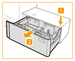 Pentru a încărca foile lungi (487,8 mm sau mai mult), închideți mai întâi magazia de hârtie pentru a ridica elevatorul interior, deschideți magazia de hârtie, apoi încărcați hârtia. Dacă încercaţi să încărcaţi hârtie când elevatorul interior este în poziţia cea mai de jos, s-ar putea ca hârtia să nu se încarce corect, putându-se produce blocaje. (Consultați