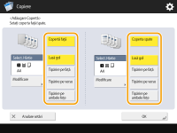 Pentru a adăuga o copertă spate, apăsați <Coperta spate>. Când copiați pe coperta spate, puteți seta unde să copiați: față, spate sau ambele părți.
