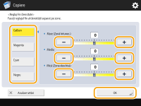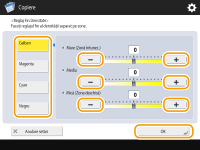 <Reglaj fin densitate>Selectaţi o culoare şi reglaţi nivelul de densitate al acesteia în funcţie de zona sa de densitate, utilizând butonul <-> sau <+>. Când reglarea este finalizată, apăsaţi <OK>.