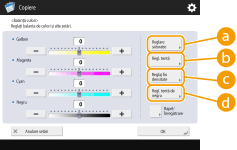 pentru <Toate culorile>. Pentru a seta fiecare culoare separat, utilizați butoanele din stânga și din dreapta fiecărei culori. Când reglarea este finalizată, apăsaţi <OK>.