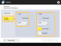 Când doriţi să deplasaţi imaginea de pe verso când copiaţi ambele feţe, este necesară setarea <Spate>. Pentru a deplasa în aceeaşi poziţie ca pe faţă, apăsaţi <La fel ca Faţa>. Pentru deplasare simetrică, apăsaţi <Opus Faţă>. Pentru a deplasa în altă poziţie decât pe faţă, apăsaţi <Setare> şi introduceţi distanţa de deplasare.