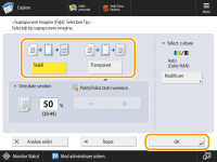 Pentru a suprapune imaginea formularului fără a regla densitatea, apăsați <Stabil>. Pentru a suprapune imaginea formularului cu densitate redusă, apăsați <Transparent> și reglați densitatea.
