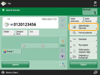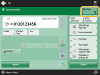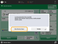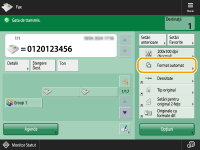 Pentru a verifica numărul total de destinaţii specificateNumărul total de destinaţii specificate este afişat în partea din dreapta-sus a ecranului. În acest fel puteţi să verificaţi dacă numărul de destinaţii este corect, înainte de trimitere. Pentru a trimite cu informaţiile despre expeditorPentru a verifica stările pentru documentele trimiseCând opţiunea <Afişare Notificare când lucrarea este acceptată> este setată la <On>, ecranul <Monitor Statut> poate fi afişat din ecranul următor care se afişează după ce este primită o lucrare trimisă. <Afişare Notificare când lucrarea este acceptată>Pentru a imprima raportul pentru rezultatele trimiteriiÎn ecranul Caracteristici de bază pentru Fax, apăsând <Opţiuni>  <Raport TX> aveţi permisiunea să setaţi să imprimaţi automat raportul cu listarea rezultatelor trimiterii. Pentru a stabili acest lucru pentru fiecare lucrare din <Opţiuni>, este necesar să selectaţi <Doar pentru erori> sau <Oprit> în <Raport TX>, apoi să setaţi <Perm. tipărirea din Opţiuni> la <Pornit>. Detectare alim. mai multe foi Când sunt alimentate mai multe coliScanarea este oprită și mesajul este afișat pe ecran. Urmaţi indicaţiile pentru deblocare. După ce ați eliminat blocajul, se afișează ecranul de reluare a lucrării. Dacă aparatul detectează în mod eronat alimentarea cu mai multe coli, apăsați <Nu detectaţi alimentare mai multe foi> pentru a relua scanarea. Pentru a seta aparatul în avans să nu vă notifice în cazul alimentării cu mai multe coli, efectuați una dintre următoarele operațiuni. De fiecare dată când trimiteți, apăsați <Opţiuni> pe ecranul Caracteristici de bază pentru fax  selectați <Detectare alim. mai multe foi> pentru a dezactiva setarea. Când fotografiile din imaginea trimisă sunt prea întunecate sau prea luminoase, culorile din fundalul originalelor color nu pot fi eliminateCalitatea imaginii trimise se poate îmbunătăţi dacă sunt îndeplinite următoarele condiţii/setări. Tip lucrare: Fax (Transmitere din memorie) sau Scanare şi transmitere (Fax/I-fax) <Select. culoare>: <Alb & Negru> (Scanare şi transmitere) <Tip original>: <Text> <Densitate>  <Densitate fundal>: <Auto> <Rezoluţie>: 200 dpi x 400 dpi, 300 dpi x 300 dpi*, 400 dpi x 400 dpi sau 600 dpi x 600 dpi* *Se poate seta pentru Scanare şi transmitere |