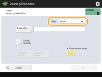 Dacă doriţi să setaţi aparatul astfel încât să puteţi verifica rezultatul de trimitere a unui document pe ecranul <Monitor Statut>, selectaţi <Plin>. Dacă nu, selectaţi <Simplu>. Reţineţi că destinatarul, de asemenea, trebuie să accepte modul de transmisie pentru a verifica rezultatul trimiterii. În funcţie de aparatul destinatarului, trimiterea unui I-fax nu este permisă decât dacă selectaţi <Simplu>.
