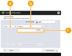 Puteţi să apăsaţi <Înregistrare la Agendă> pentru a înregistra destinaţia introdusă. Setaţi condiţiile necesare şi specificaţi <Nume> şi <Agenda>. Pentru informaţii despre setări, consultaţi