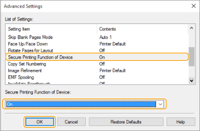 Selectați [On] la [Secure Printing Function of Device] și faceți clic pe [OK].