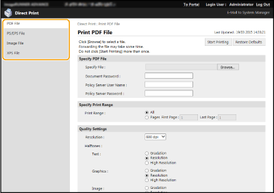 ![]() | Utilizând IU la distanţă, este posibil să imprimaţi fişiere, salvate pe un computer sau în reţea, direct de la aparat fără a utiliza driverul de imprimantă. Nu este necesar să deschideţi fişierele pe computer pentru a le imprima. |