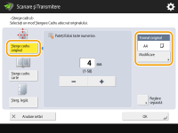 1 | Apăsaţi <Şterge cadru carte> şi verificaţi <Format Original>. ![]() Dacă dimensiunea afişată la <Format Original> este diferită de dimensiunea cărţii, apăsaţi <Modificare> pentru a selecta dimensiunea. Pot fi scanate numai dimensiunile de originale prezentate pe afişajul panoului tactil. |