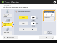 <Şterge Cadru>.1 | Apăsaţi <Şterge cadru original> şi verificaţi <Format Original>. ![]() Dacă dimensiunea afişată la <Format Original> este diferită de dimensiunea originalului, apăsaţi <Modificare> pentru a selecta dimensiunea. Pot fi scanate numai dimensiunile de originale prezentate pe afişajul panoului tactil. |