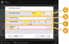 2 | Apăsaţi <Pornit> în <Folosiţi adresa manuală> şi efectuaţi setările necesare. ![]() <Folosiţi adresa manuală>Apăsați <Pornit>. <Adresa manuală>Apăsaţi butonul <Adresa manuală> şi introduceţi o adresă. Următoarele adrese nu pot fi utilizate. Adresele care încep cu „ff” (adresă de difuzare multiplă) Adresele care conţin numai „0” Adrese compatibile IPv4 (adrese IPv6 în care cei 96 de biţi superiori sunt „0” cu o adresă IPv4 conţinută în cei 32 de biţi inferiori) Adrese mapate IPv4 (adrese IPv6 în care cei 96 de biţi superiori sunt „0:0:0:0:ffff:” cu o adresă IPv4 conţinută în cei 32 de biţi inferiori) <Lungime prefix>Lungimea secţiunii de adresă de reţea poate fi modificată. <Adresă ruter implicită>Apăsaţi <Adresă ruter implicită> şi introduceţi o adresă. Următoarele adrese nu pot fi utilizate. Adresele care încep cu „ff” (adresă de difuzare multiplă). Adresele care conţin numai „0” Dacă nu specificaţi o adresă, lăsaţi coloana necompletată. |