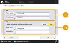 2 | Efectuaţi setările necesare. ![]() <IPv4>Apăsaţi <Nume gazdă> şi introduceţi numele de gazdă al aparatului pentru a vă înregistra pe serverul DNS utilizând caractere alfanumerice. Apăsaţi <Nume domeniu> şi introduceţi numele domeniului de care aparţine aparatul utilizând caractere alfanumerice (Exemplu: „exemplu.com”). <IPv6>Pentru a seta ca numele gazdei şi numele domeniului să fie identice cu IPv4, apăsaţi <Pornit> din <Folosiţi acelaşi Nume Gazdă/Nume Domeniu ca IPv4>. Pentru a seta să fie diferite de cele ale IPv4, apăsaţi <Oprit>. Pentru a seta ca numele gazdei să fie diferit de IPv4, apăsaţi <Nume gazdă> şi introduceţi numele de gazdă al aparatului pentru a vă înregistra pe serverul DNS utilizând caractere alfanumerice. Pentru a seta ca numele de domeniu să fie diferit de IPv4, apăsaţi <Nume domeniu> şi introduceţi numele de domeniu de care aparţine aparatul utilizând caractere alfanumerice. (Exemplu: „exemplu.com”). ![]() Dacă setaţi <Folosiţi DHCPv6> la <Pornit> pentru setări de adrese cu nume de ţară (Setarea unei adrese IPv6), numele de domeniu configurat manual este suprascris. Dacă setaţi <Folosiţi acelaşi Nume Gazdă/Nume Domeniu ca IPv4> la <Pornit>, este utilizat numele de domeniu preluat de pe serverul DHCPv6. |