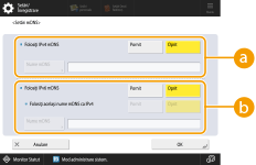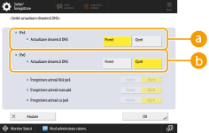 2 | Efectuaţi setările necesare. ![]() <IPv4>Pentru a actualiza automat informaţiile când corespondenţa dintre numele de gazdă şi adresa IP este schimbată într-un mediu precum DHCP, apăsaţi <Pornit> în <Actualizare dinamică DNS>. <IPv6>Pentru a actualiza automat informaţiile când corespondenţa dintre numele de gazdă şi adresa IP este schimbată într-un mediu precum DHCP, apăsaţi <Pornit> în <Actualizare dinamică DNS>. Comutaţi pe <Pornit> adresa cu care doriţi să vă înregistraţi ca server DNS <Înregistrare adresă fără ţară>/<Înregistrare adresă manuală>/<Înregistrare adresă cu ţară>. Reţineţi că actualizarea automată nu poate fi efectuată dacă toate opţiunile sunt setate la <Oprit>. |
